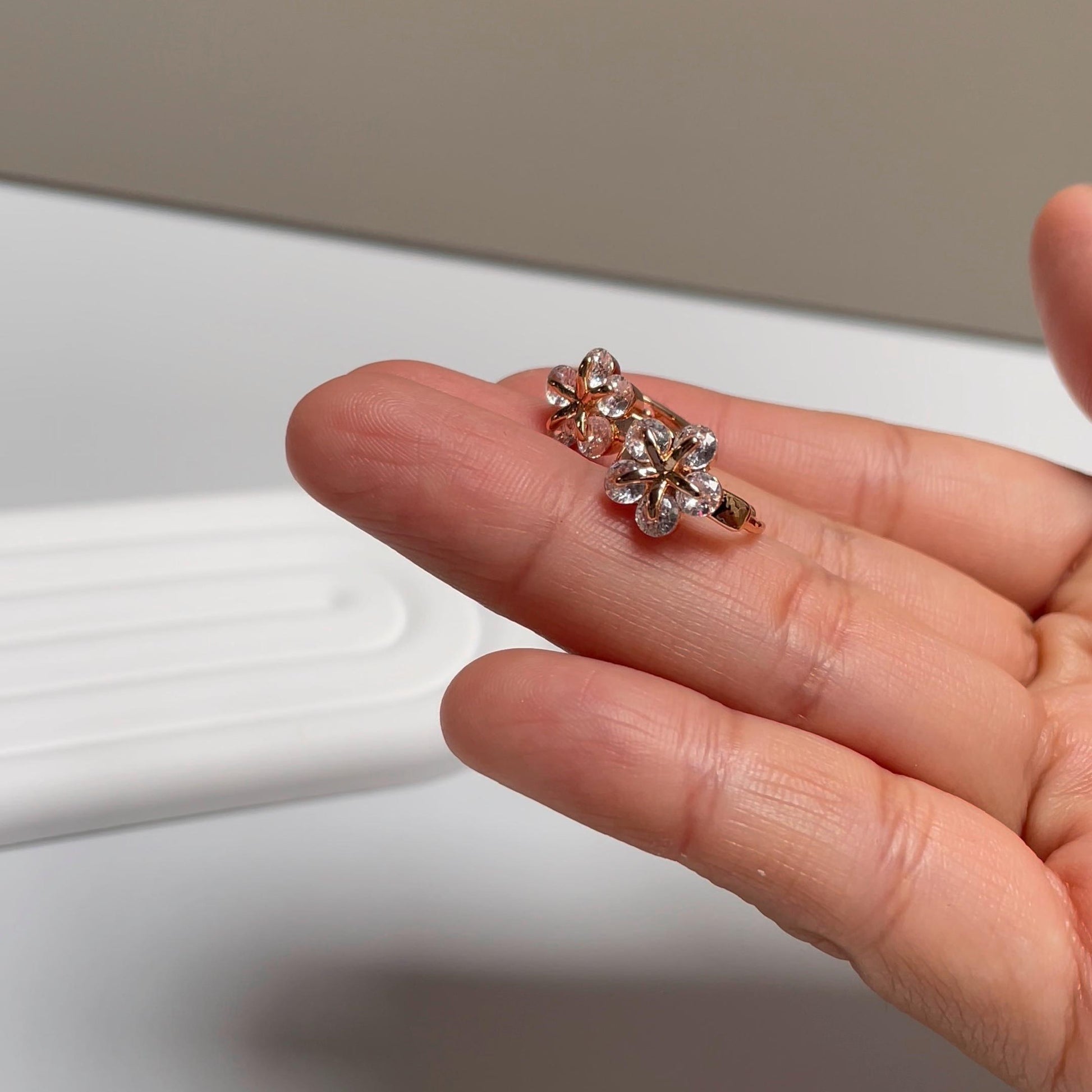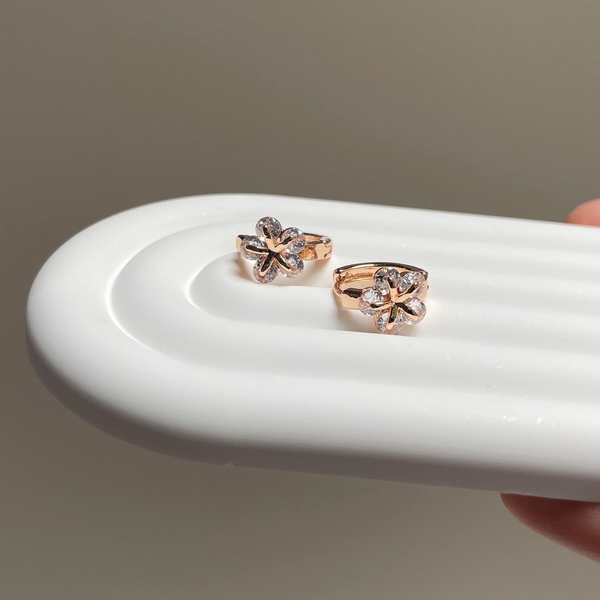Bellísimas y delicadas argollas con pétalos de flor con cristales. Con baño de oro rosa 18k, que le aporta ese acabado, color delicado y calidad A1.