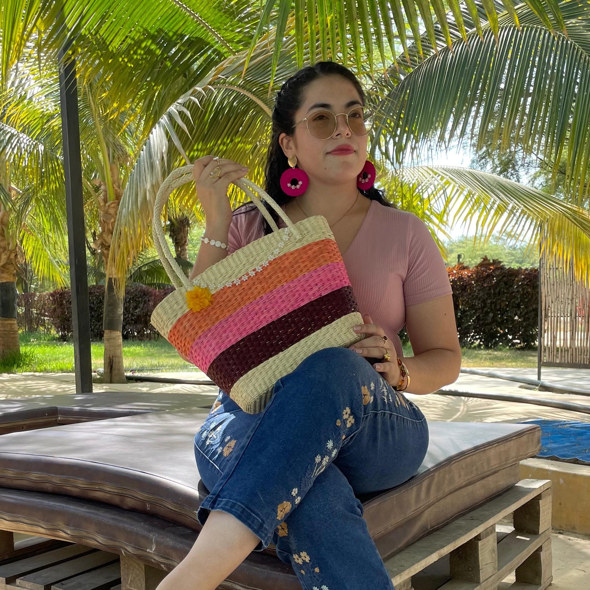Hermosa cartera hecha 100% a mano con fibra vegetal de paja toquilla y agregados de mostacillas checas y flores de tela.