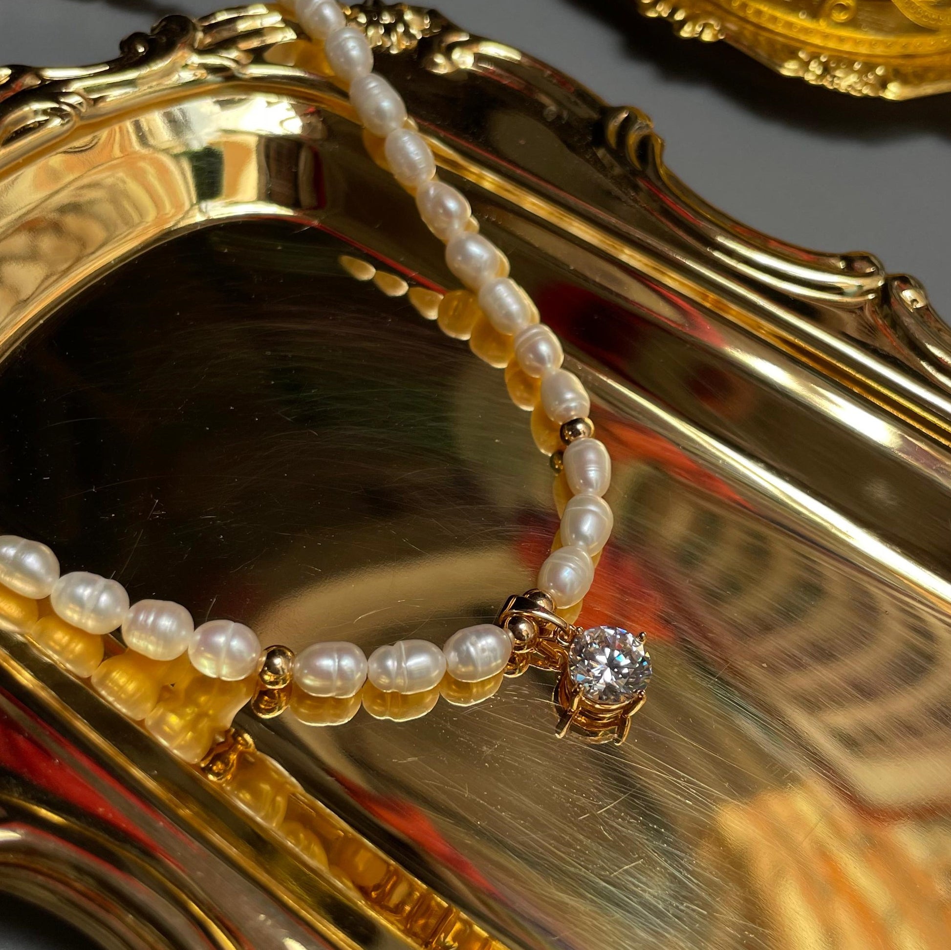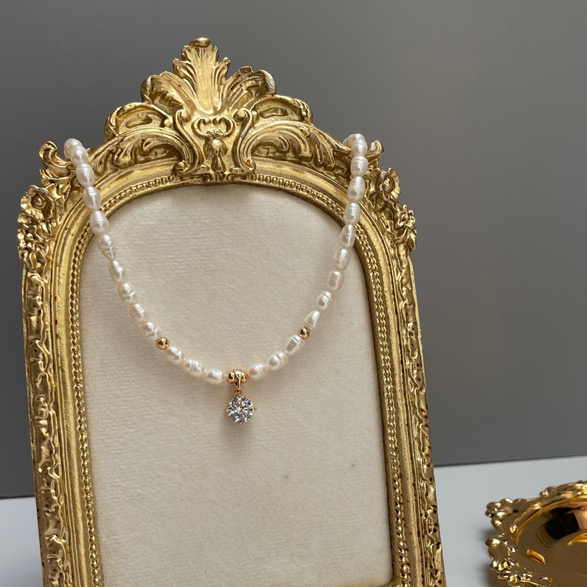 Belleza y elegancia con este hermoso collar con perlas de río y acero gold rosé. Terminaciones y dije con baño de oro rosa 18k.