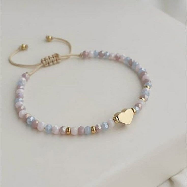 Pulsera con dije de corazón, muranos en tonos celestes, lilas, billas de acero inoxidable e hilo chino. Regulable.