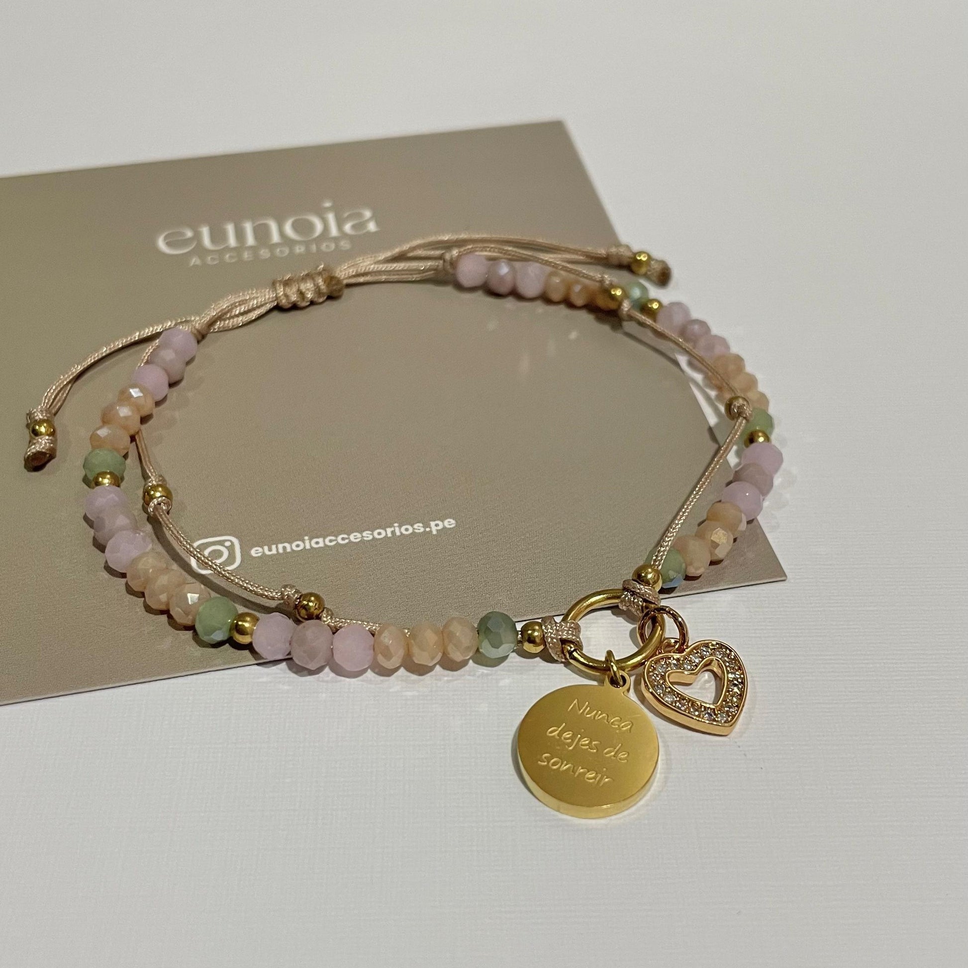 Bella pulserita con muranos y dos dijes hermosos: un corazón y una placa con frase. Pídela en tonos: azul, rosado, celeste, verde, negro, rojo, naranja.